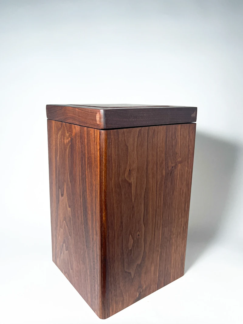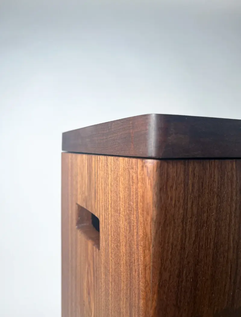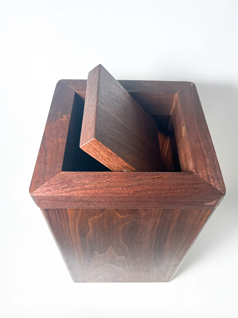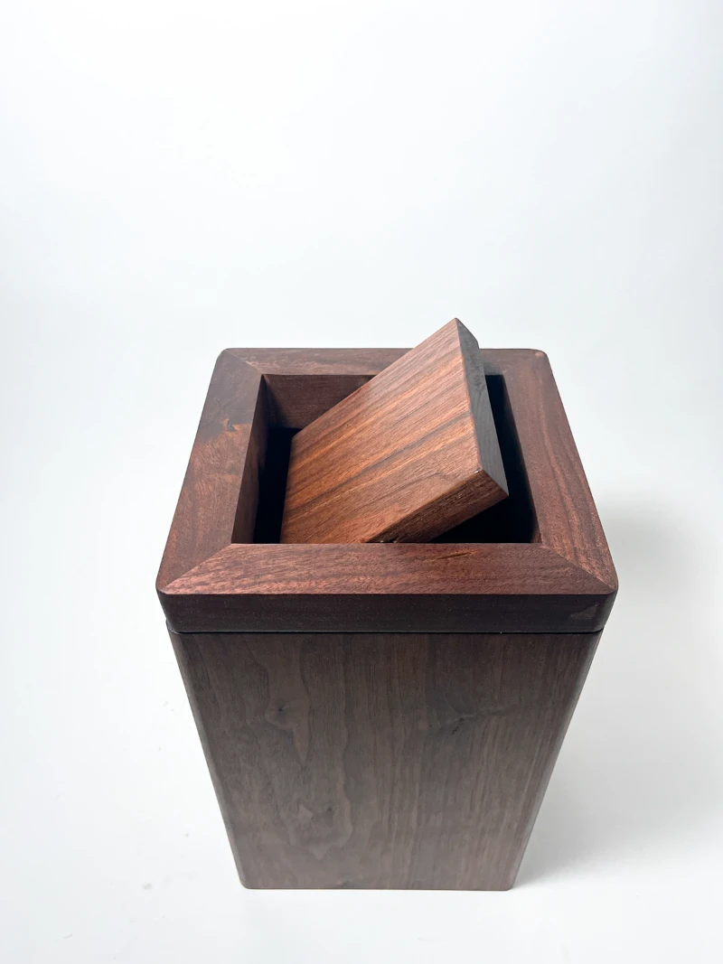 This wood trash can bin is crafted from solid walnut, known for its gorgeous grain, strength, and classic beauty. It’s the kind of wood you find in heirloom furniture, and for good reason: it holds up for generations.